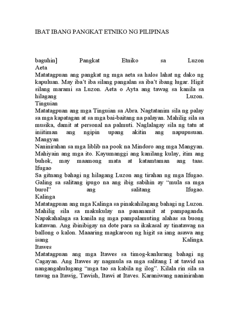 Ang mga pangat etniko sa bansa natin ay nakikilala sa kanilang sarili sa isa o higit pang mga aspeto katulad ng kultura wika kasaysayan at iba pa. PANGKAT ETNIKO SA LUZON Sa paksang ito ating alamin ang sagot sa katanungang kung ano ba ang mga ibat ibang mga pangkat etniko sa Luzon. It has 6 stars with 11 forks.