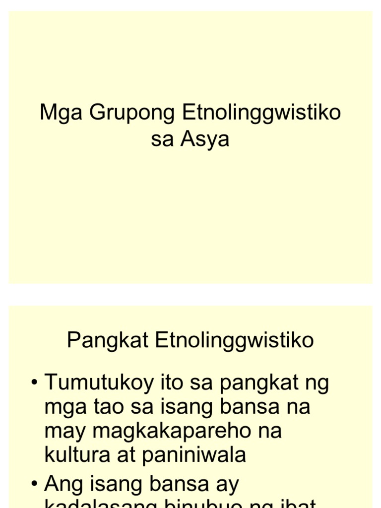 Learn vocabulary terms and more with flashcards. PANGKAT ETNOLINGGWISTIKO SA ASYA Asyano ang mga taong naninirahan sa Asya. Nakikilala din sila batay sa bansang pinagmulan gaya ng Pilipino nagmula sa Pilipinas Japanese mula Japan Vietnamese mula sa Vietnam.