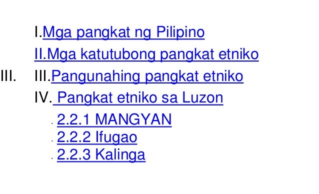 Contextual translation of mga larawan ng pangkat etniko ng luzon mangyan into English. Pangkat ng Minorayang Kultural sa Luzon- aNegrito o Ita- Sinasabing pinagmulan ng lahi ng mga unang taong nakarating sa Pilipinas sa pamamagitan ng lupang tulayLikas sa kanila ang magpalipat. 7 sa Luzon 8 sa Visayas 9 sa Mindanao at may isang pangkat na Isneg.