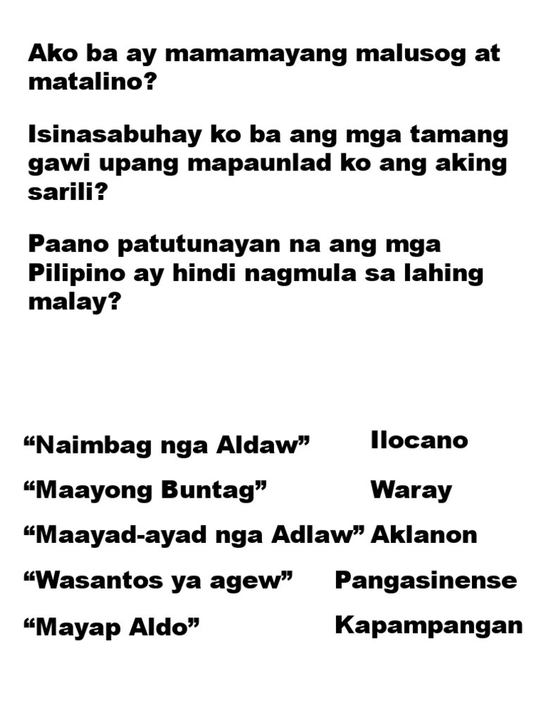 People of the current na tumutukoy sa kanilang lupang tinubuan sa Kapuluan ng Sulu. Bahagi ng tinatawag na barayiti ng wika ang mga salita ng ilang pangkat etniko sa bansa. Gawain sa Pagkatuto Bilang 3 Panuto.